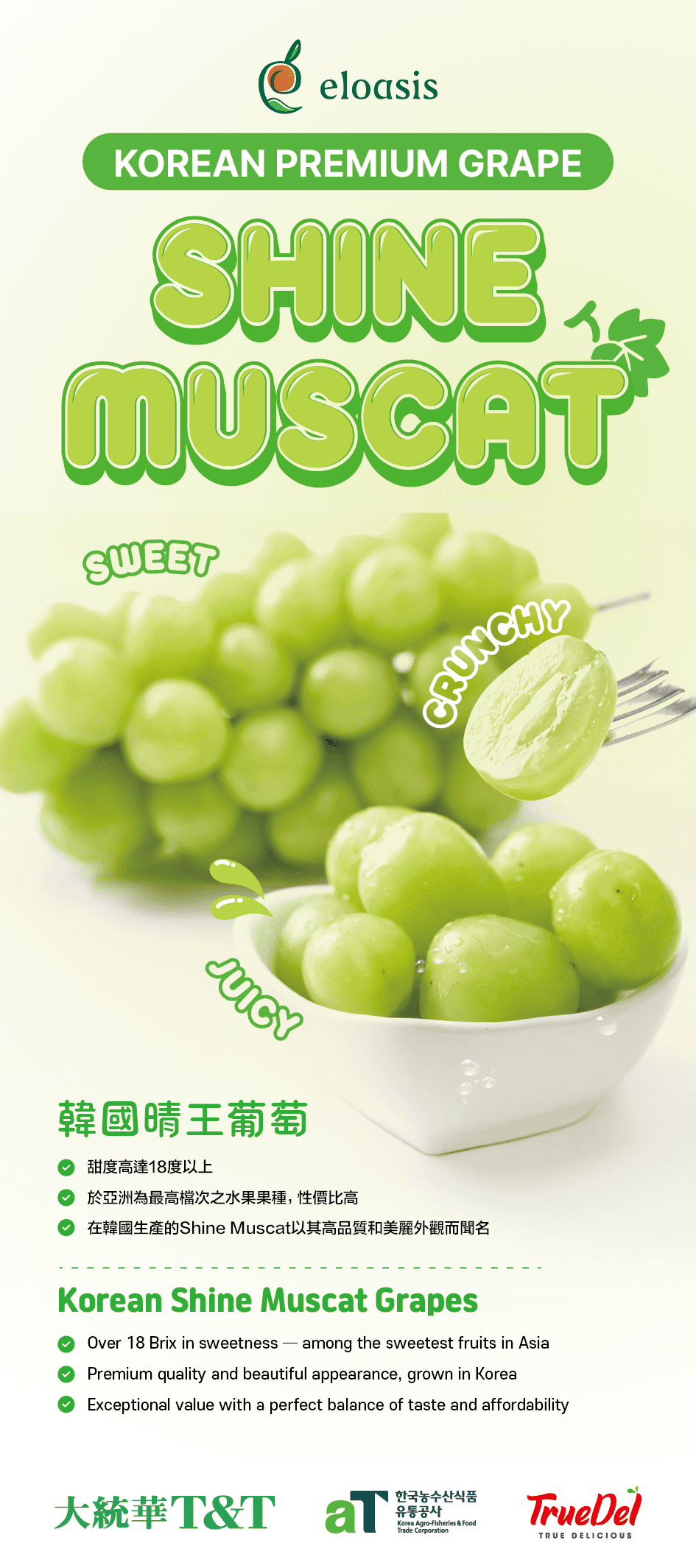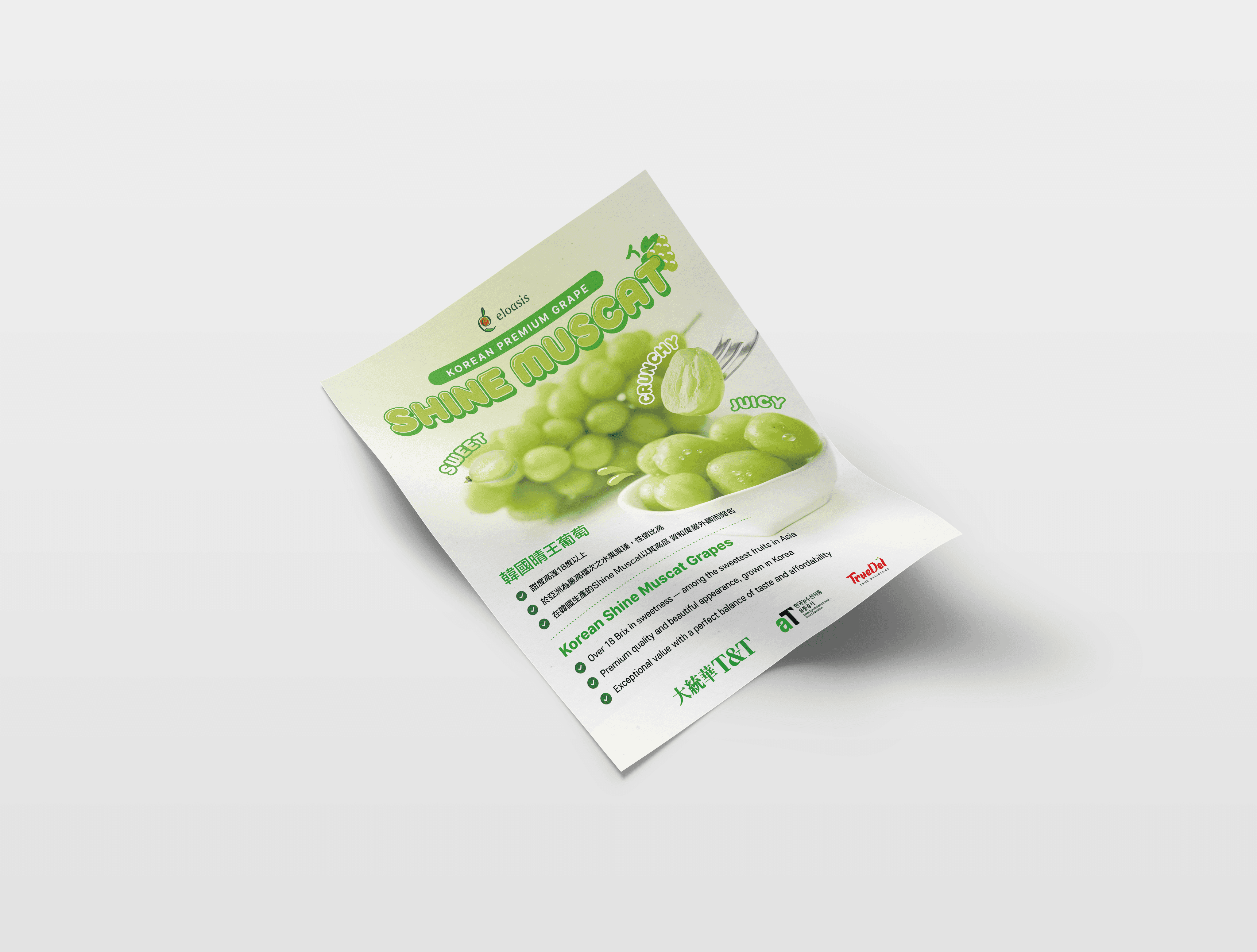 Designed promotional banners and flyers for Shine Muscat products supplied to TNT Supermarket, using a clean palette to convey freshness and premium quality.